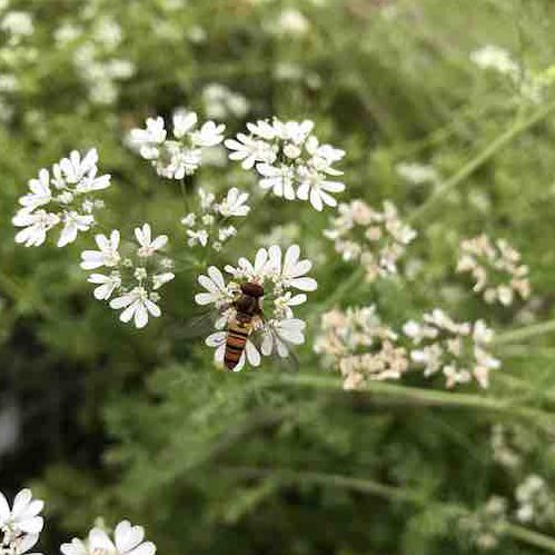 そこに当園の従業員、ホソヒラタアブが花から花へと飛び回り、受粉のお仕事を遂行中です。徐々に青い実がついてきました。これぞコリアンダーシード!5月中旬あたりに数量限定で出荷できるように調整中です。花が実に変化するまで、もう少々お待ちください。